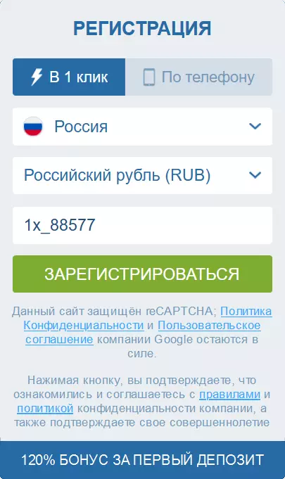 Чтобы увеличить максимальную сумму бонуса за первый депозит с 120% до 130%, введите промокод 1x_88577 при регистрации.